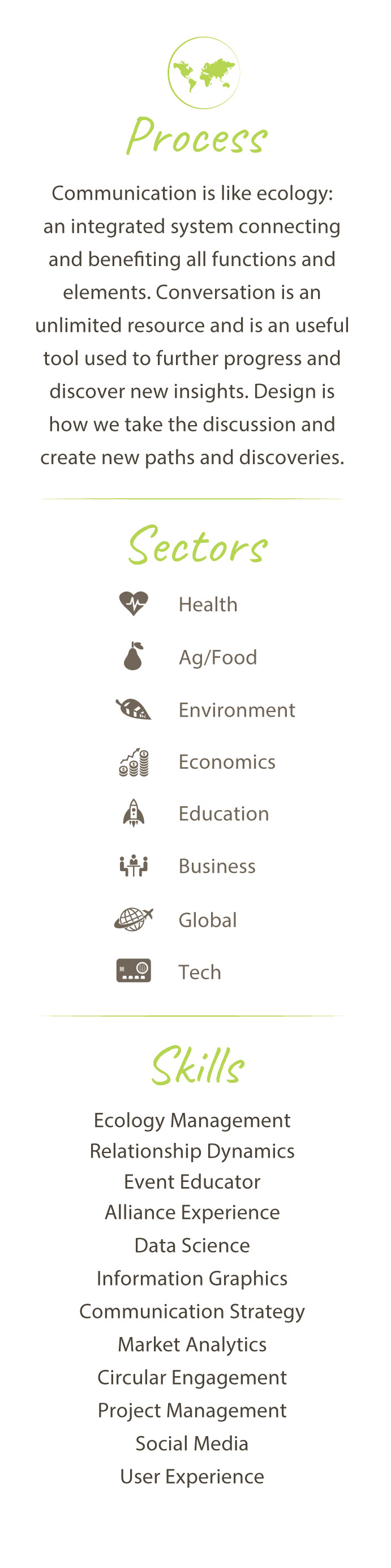 Ecosystem designer. Always being naturally curious and constantly looking to improve upon systems has led me to focus on providing creative vision with strategic direction. Looking at patterns, design, and how things are connected is the art of understanding symbiotic relationships. From designing an ecological-based farm to creating communications strategies for ocean initiatives, work is derived from the models, systems, and elements that connect. These techniques help solve complex human and environmental challenges.
