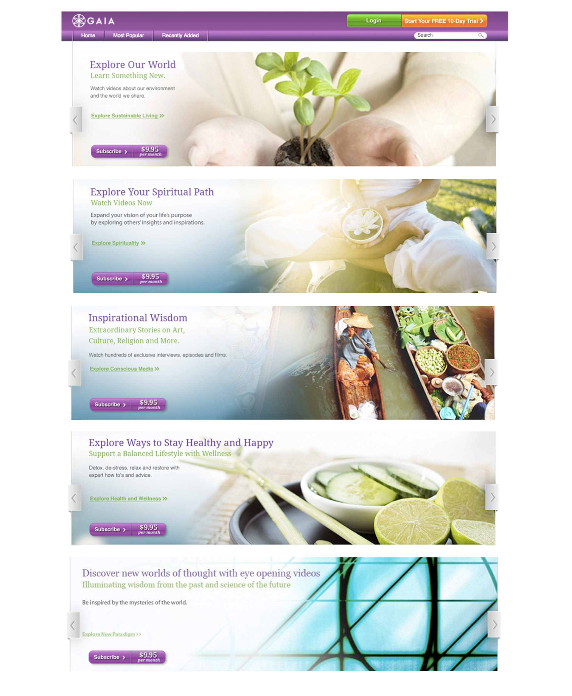 Assisted a team in launching Gaia TV for web by exploring hundreds of ways to display Gaiam's shows and documentaries, as well as designing enticing website artwork.